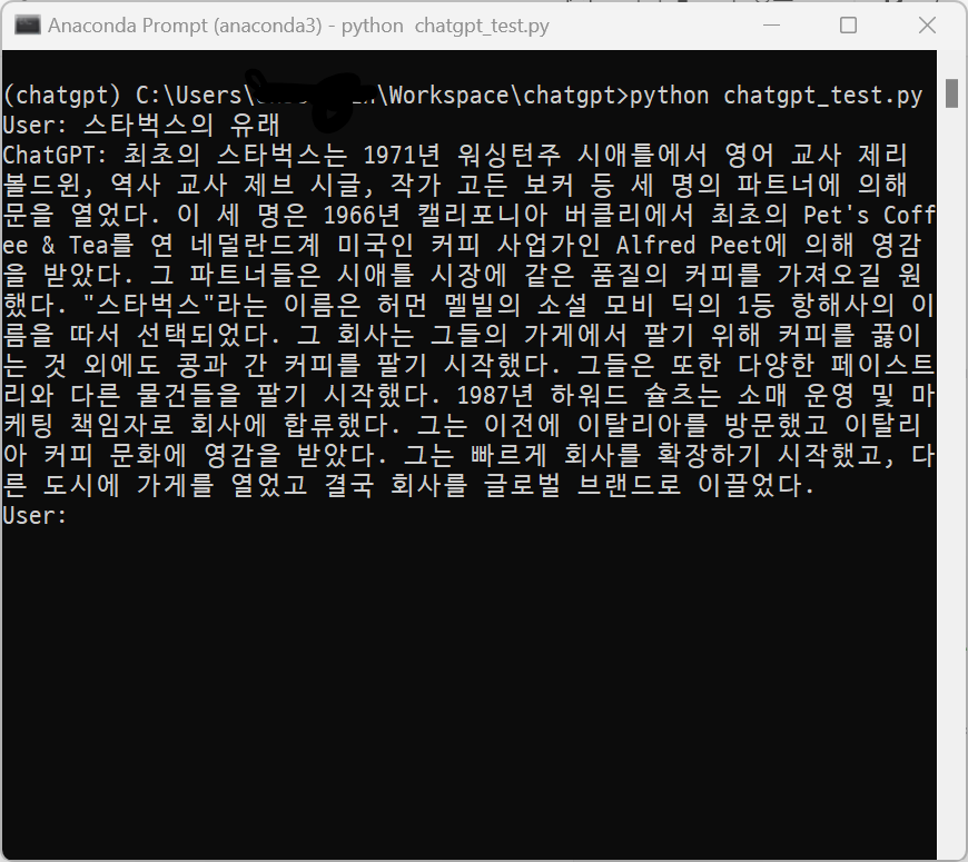 print(f'ChatGPT: {papago(response, "en", "ko")}') # 무조건 한글로 대답. 위 두 개중 쓰고싶은거 아무거나